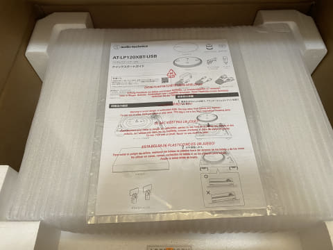 レコードプレーヤーに限った話ではないが、自宅に大きい段ボールが届いて、テープをカッターで丁寧に切る時の高揚感はいつになっても衰えることがない。それではまずAT-LP120XBT-USBから組み立てていこうと思う。