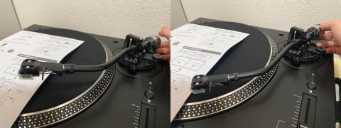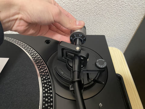 なになに……「カウンターウェイトを逆時計回りに回してトーンアームが水平になるように調節してください」か。書かれた通りにカウンターウェイトを回してみると……なんとトーンアームの角度が変化した。特に重量を与えているわけでもないのに、だ。