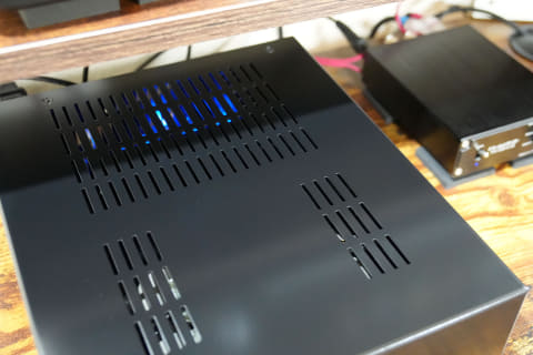 内部構造は、手前側にRコアトランス、奥側にヒートシンクと基板が配置されている。電源スイッチは背面にあって、傍にACインレットとヒューズケースが併設されている。DCジャックは、1つのみ。電源を入れると、内部の青いLEDが光る。