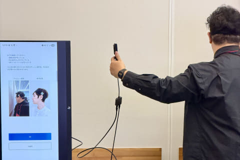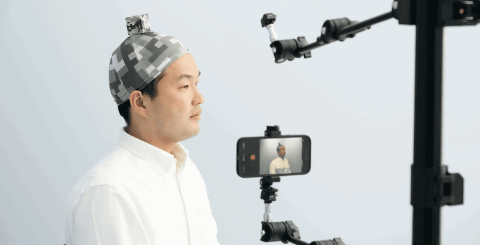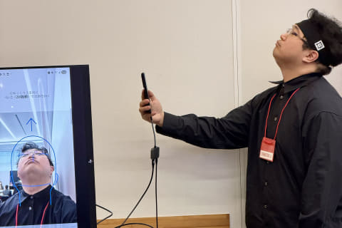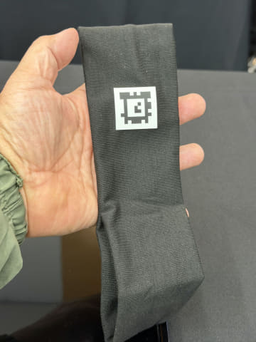 まず頭にARマーカーの印刷されたヘッドバンドを、マーカーが耳の位置にくるように装着する。これはさほど難しくないが、マーカーが髪の毛などで隠れないようにしなければならない。(マスクはスキャン時には外す必要があるが、メガネはそのままでも良いようだ)