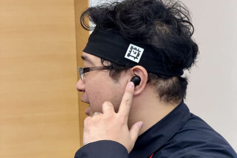 この次が面白いのだが、今度は「イヤピースを外して」耳に付け直す。これは通常外で開放で聴いている状態を再現するためだという。同様にスイープ音で測定する。この時には周囲は静かでなければならない(イベントではクマさんが周囲に静かにしてくださいと声かけをした)。また、イヤーピースを外すのでイヤフォンを指で押さえなければならないので、安全のために片耳ずつ行なう必要がある。