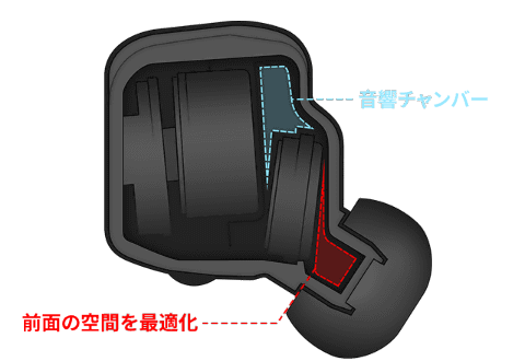 このドライバーの特性を最大限に引き出せるよう、ドライバー前面の音響空間を最適化。加えて、ノズルの長さや角度の調整、音響チャンバーの緻密な設計は、ノイズキャンセリング性能の向上にも寄与している。