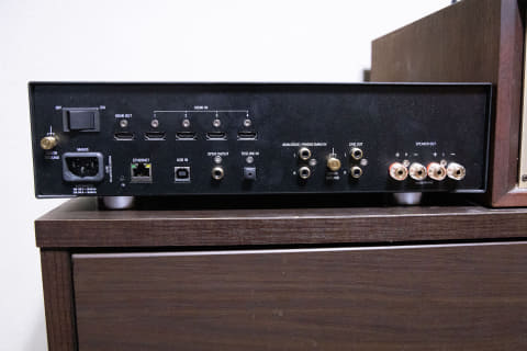 スピーカーターミナルは懐かしいプッシュ式です。使えるスピーカーケーブルが限られますし、孔に通すのに一苦労しますが、今様の高級スピ―カーターミナルよりもプッシュ式の方が外れにくかったりします。