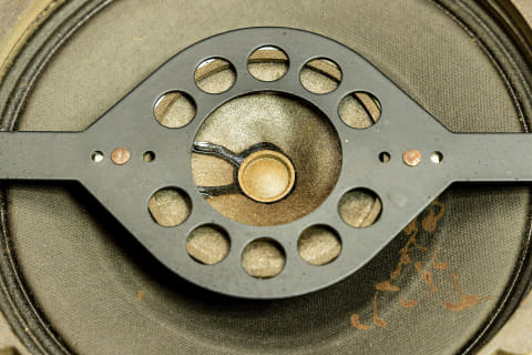 クロスオーバー周波数は2kHzで、ネットワーク回路(コンデンサー)はブリッジ部分に取り付けられています。コイルの姿が見当たらないので、遮断特性はおそらく-6dB/octと思われます。公表されている周波数特性は、ハイレゾオーディオロゴとは無縁の50Hz~14kHz。驚くべきは出力音圧レベルで、なんと106.5dB/W/1.2mという高能率。これなら2A3など真空管を使った小出力シングルアンプでも楽しめそうです