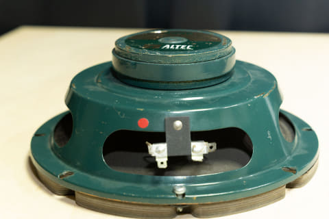 ユニットを裏返すとフレームにはアルテック・グリーンが塗られており、筆者にはエメラルドよりも美しく輝いて見えます。古い資料によると磁気回路はツイーター側がアルニコ、ウーファー側がセラミック(フェライト)マグネットとアナウンスされていましたが、筆者の個体はツイーターもフェライトマグネットのようでした