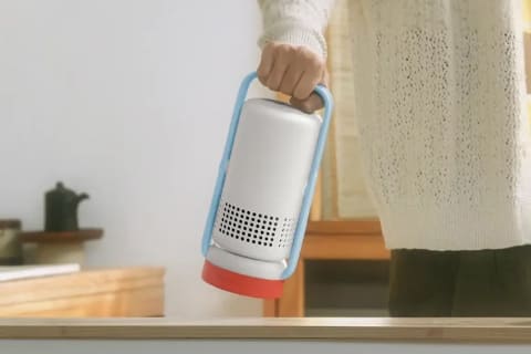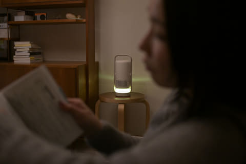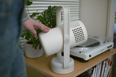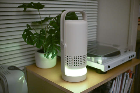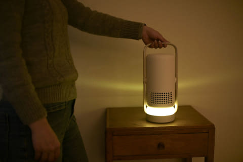 角のない丸みを帯びたフォルムで、ポータブルライトやランタンのような印象。家電やガジェット感が抑えられていて、暮らしの空間にスッと馴染みます。
