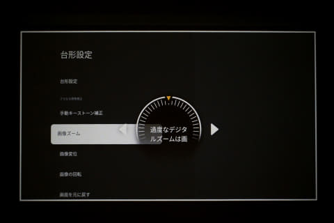 「画面の歪みは直ったけれど、サイズが妙に大きくなった」という時は、設定メニューの「台形設定」から、「画像ズーム」と「画像変位」をチェック。ある程度調整できるから、映したい場所に “ちょうどいいサイズ” で、“ちょうどいい位置” を設定できます。
