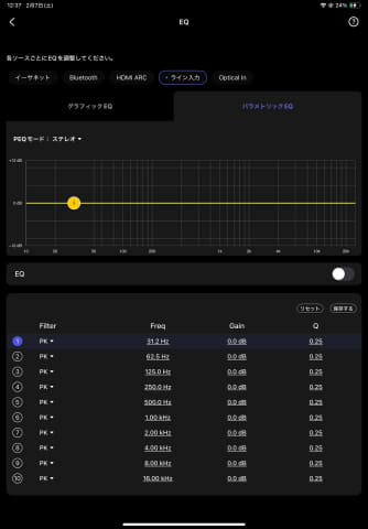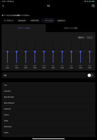 機能面を見ていくと、アプリ内にイコライジング機能も発見。グラフィックイコライザーのほか、パラメトリックイコライザーとしても調整できるようになっています。トーンコントロール機能やイコライザー機能を搭載する機械は、かなり減ってしまいました。ですが音楽鑑賞には有用なので、各社とも採用して欲しいものです。