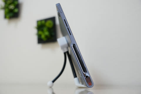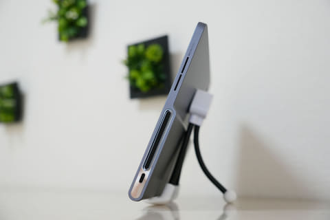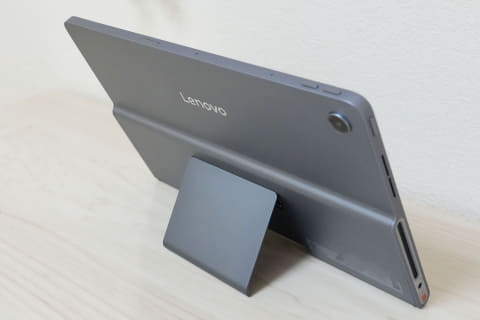 Lenovo Tab Plusは、見た目からして普通のタブレットとは異なる。リアに備わったキックスタンドは、別途スタンドを用意しなくても自立する便利な機構。動画鑑賞だけでなく、ペンを使うクリエイティブ用途でも活用できるよう、傾斜はリニアに変えられる。
