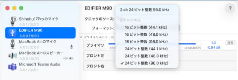 まずはUSB-CケーブルでMacBook Airと接続し、ファイル再生を開始。「Audio MIDI設定」を起動すると、M90が最大入力96kHz/24bitのデバイスとして認識されていることを確認できた。