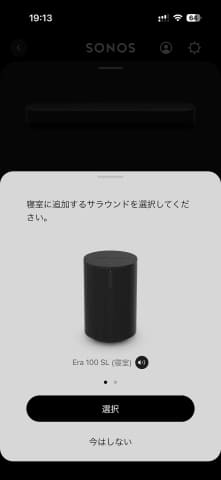 サラウンドのセットアップは「Sonos」アプリから行なう。アプリ右上の歯車マークからBeam(Gen2)を選択、中段に表示されている「サラウンドを設定する」をタップすると、どのスピーカーをサラウンドにするかを尋ねられるので、同じ部屋でセットアップしたEra 100 SLを選択する。