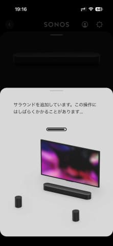Era 100 SLを選択すると、片方のEra 100 SLからチャイム音が再生され、「左右どちらのリアスピーカーが鳴っているか」を尋ねられる。選択したあとは、アプリ側で処理が行なわれ、2~3分でサラウンドとしてのセットアップが完了する。