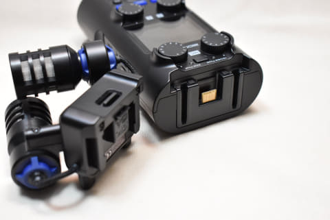 このマイク部分はユニットとなっていて取り外しが可能になっている。接続部が規格化されていて、別売のステレオショットガンマイクやワイヤレスラベリアマイクユニット、デュアルXLR/TRSコンボ入力ユニットを取り付けることができる。