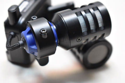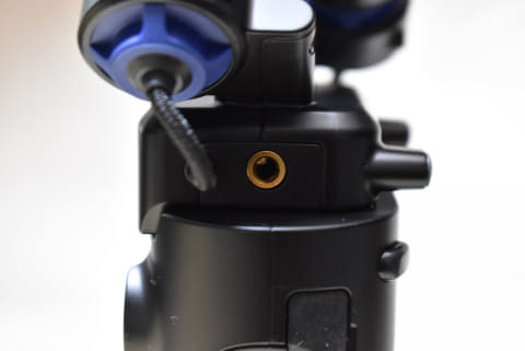 改めて、このH5studioのマイクを見てみると、確かに口径が大きいのとともに、トップ部分およびサイド部分にスリットが入っている。また、そのマイクユニットと土台の間に青いシリコンのようなものがあるが、これがショックマウントの役割をしている。