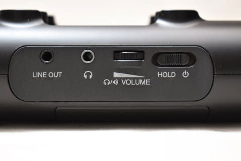本体左サイドを見ると、3.5mmのライン出力とヘッドフォン出力がそれぞれ用意されており、その横にはヘッドフォン出力を調整するボリューム、さらにその右には電源スイッチがある。