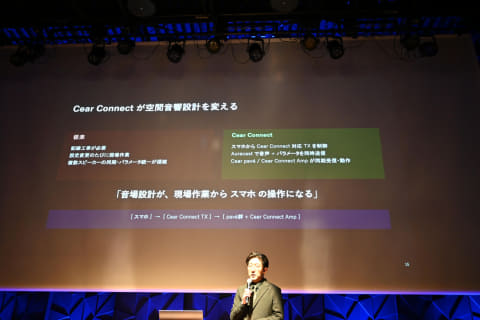 「Cear pavéまたはCear Connect基板を使えば、スピーカーを無限に並べて音場制御することが理論上可能になる」と述べた。実際のデモは3台構成だが、村山氏は「それでも十分面白いはず」と自信を示した。
