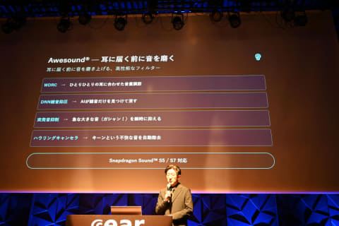 今回初めて詳細が明かされた技術の一つが「Awesound」だ。聴覚拡張を目的としたIPで、そのライセンスは補聴器メーカーのリオンが保有しており、シーイヤーが同社から許諾を受けて活用するかたちをとる。