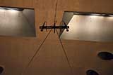 まず最初に案内されたのは、舞台裏ではなくて、舞台そのものである東京文化会館小ホール。ちょうど休憩時間であったために入れたのだが、ステージ上にはマイクのセッティングがない。頭上を見上げると、天井の高さ11mというホールにおいて、下から5.7mの位置にマイクがセッティングされていた。