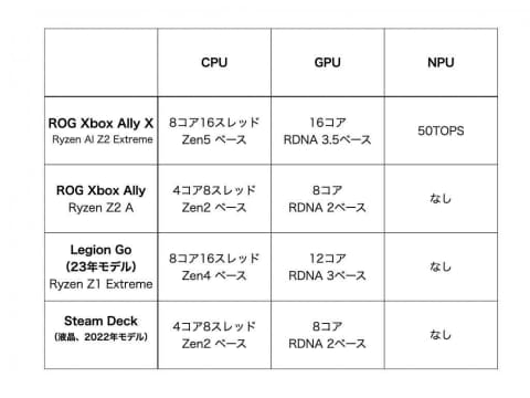 以下に表にしてあるが、ROG Xbox Allyで採用されている「Ryzen Z2A」はアーキテクチャの世代が古く、CPU・GPUのコア数やメモリ帯域、NPUの有無など差異が非常に多い。