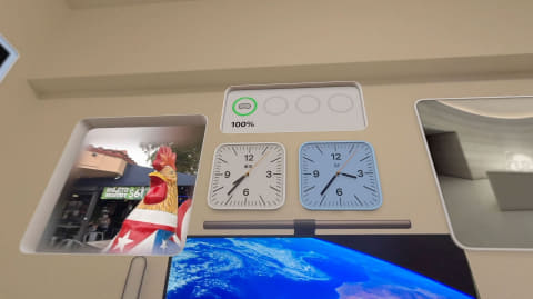 時計やバッテリー表示はもちろん、写真フレームなども本物ではなく、Vision Proが描くCG。空間フォトを配置すると当然立体に見える。パノラマ写真を貼り付けて覗き込むと、まるで窓の外に広い風景が存在しているかのような体験ができる。