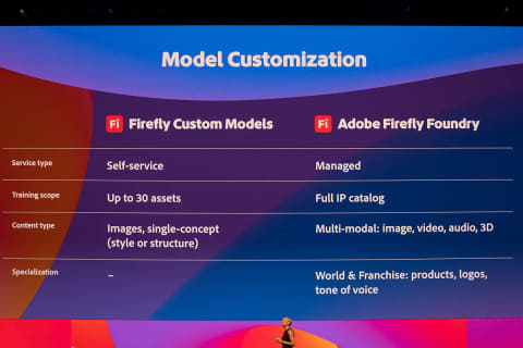 企業のマーケティングツールである「Adobe Gen Studio」では、以前から「その企業のルールやトーン、マナーに合わせた生成AI」としてカスタムモデルが利用可能になっており、今回さらに、カスタムモデルの構築をアドビが請け負う「Firefly Foundry」というサービスも登場した。