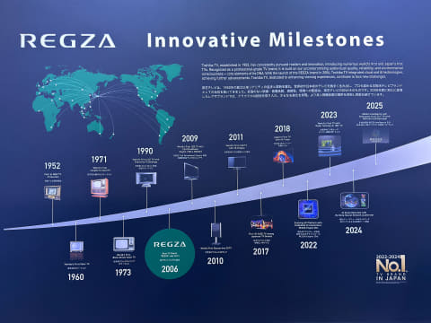 実は、REGZAは今年でブランド展開20周年を迎える。以下の年表を含めたプロモーション展開は、日本ではまだ進められていない。アメリカでの公開が先行しているが、今年の新製品プロモーションの時期から日本でも展開が予定されているという。