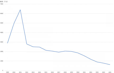 そのあとは急だ。コロナ禍に入ると年率25%近く出荷数量が減り、2025年末には年間62万3,000台まで落ち込んだ。