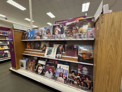 以下の写真は、2024年の秋にアメリカで、量販店「Target」のソフト売り場を撮影したものだ。もはやCDやDVDは少なく、音楽用のレコードが目立つ。Blu-rayの姿も見えない。レコードが目立つのは音質が良いからではなく、ジャケットが大きくて「アーティストのグッズとしての価値が高い」からだ。
