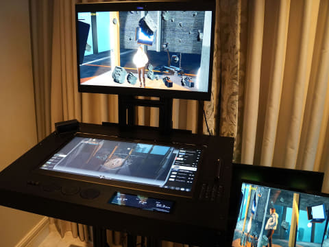 すぐ隣には、撮影した映像を編集・カラーグレーディングできる席があり、マスターモニターやコントロール卓も配備されている。この日はMocopiを使ったモーションキャプチャの設備や、立体で撮影映像を確認するための「空間再現ディスプレイ」も配置されていた。