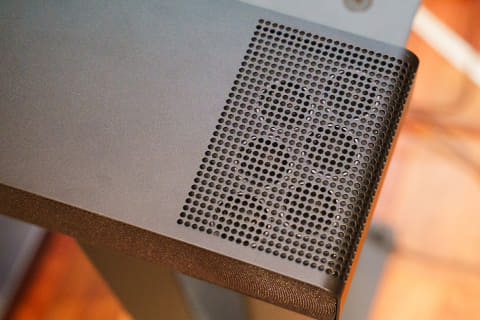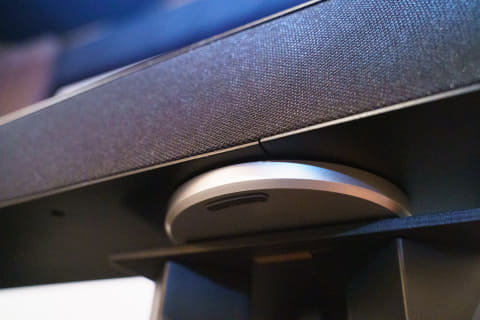 そして、外観の特徴ともなっているのが、サウンドバー部分のスチール製の高強度な筐体と大口径の樹脂製脚部。スチール製の高剛性な作りで振動を抑え、さらに大型の脚部で微細な振動までも受け止める作りはまさにHi-Fiスピーカーの発想。サブウーファー部は厚みのある木製キャビネットを採用している。