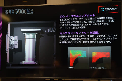 別体型のワイヤレスサブウーファーは、17cmコーン型ドライバー1基を内蔵したバスレフ型で、バスレフポートの形状を水平・垂直方向ともに対称な形状とした「シンメトリカルフレアポート」を採用。これは管楽器などの開発に使用されるPIV(Particle Image Velocimetry)計測を活用して開発されたものので、低音のエネルギーの大きな空気の流れをスムーズに排出してノイズを抑えるというもの。それに加えて、サブウーファー出力の周波数帯域を分割して、それぞれに対して独立でリミッターをかけるマルチバンドリミッターを採用し、瞬間的な大きな音が出るような場合でも、低域の量感を保ちつつ、音が歪むなどの破綻が生じないように低音再現ができるようになっている。
