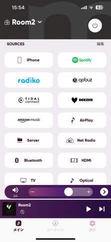 MusicCastアプリでQobuzを再生してみた。サウンドモードは「3D MUSIC」。これはAURO-3Dを使った音楽用のサラウンド再生モード。このほか、音源そのままの「STRAIGHT」、サラウンド化をしない「STEREO」、そしてソースに合わせて自動的に最適なサラウンド化を行う独自の「SURROUND:AI」がある。このほか、音声を聞き取りやすくする「CLEAR VOICE」、低音を増強する「BASS EXT」などの機能もあるが、今回は比較的大きめの音量で再生していたこともあり、「CLEAR VOICE」、「BASSS EXT」は使用していない。