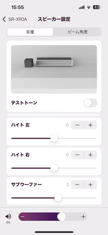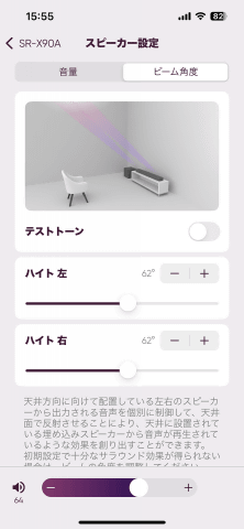 この調整で面白いのは、テストトーンを流しながら行なうと、ハイトチャンネルの聞こえてくる位置が実際に移動すること。ビーム角度では部屋の形状や材質で、聞こえにくい箇所とそうでない箇所があるので、テストトーンが明瞭に聞こえる場所にするとよい。