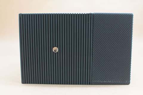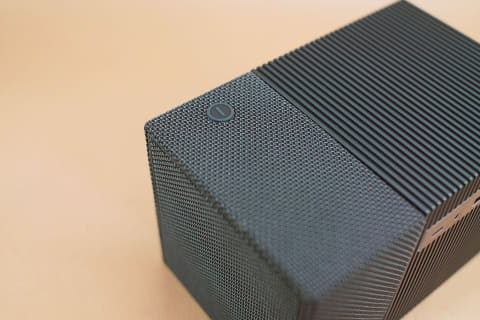 左側の電源部はファブリック素材で覆われており、天面に電源ボタンがある。またスピーカーも上向きに配置されている。5Wのフルレンジモノラルだが、Dolby Digital Plus対応だ。