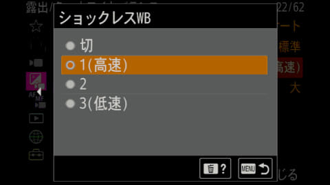 ショックレスホワイトバランスは、スタンダード、雰囲気優先、ホワイト優先の3モードがある。また追従速度は3段階で選択できる。サンプルの動画は、スタンダードで追従速度最速で撮影している。