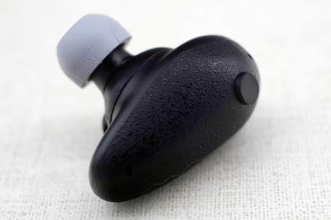 TONALITEのボディは、細長い卵型という独特の形状になっている。耳穴のくぼみに入って本体を固定する円形部分にはシリコンのアジャストリングがとりつけられており、中空になったシリコンが飛び出している。ここがクッションとなり、柔らかく耳に本体が固定されるというわけだ。リングは2サイズが付属する。