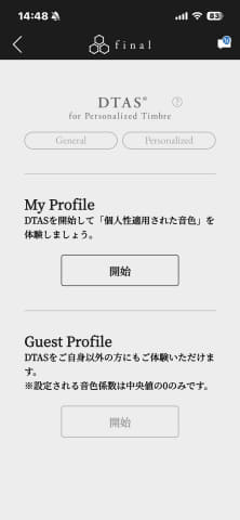 ではどのように測定するのか、実際に試してみる。使用するスマホアプリは、TONALITE専用アプリだ。「DTAS」をタップすると、My ProfileとGuest Profileを作るボタンがある。自分のプロファイル以外に、ゲスト用のプロファイルが1つだけ持てるというわけだ。測定と演算にだいたい40分ぐらいかかる。