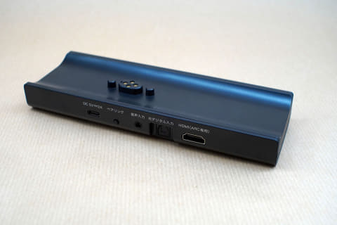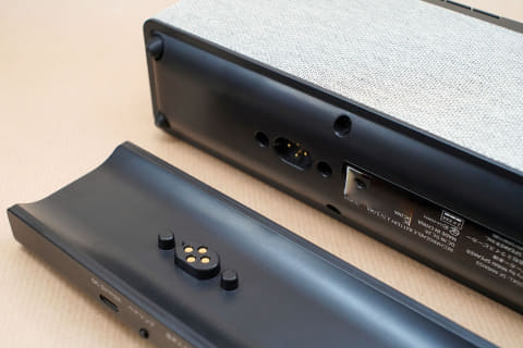 まずはベースユニットから見てみよう。スピーカーよりもやや小さめに設計されたベースユニットだが、よく見るとスピーカーの脚部がベースをまたぐ格好でドッキングする。スピーカー底部とベース上部には独自の4端子の接続部があり、ここで充電と音声伝送を行なう。