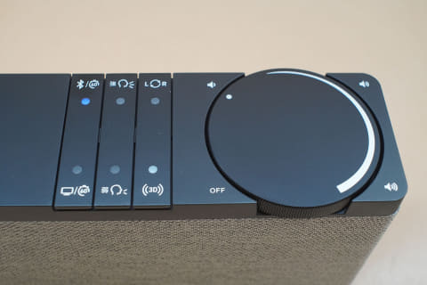 上部には電源ボタンを兼ねた大きめのボリュームダイヤルがある。中央部にある3本のバーは上下がそれぞれスイッチになっており、左からBluetoothとベース側入力の切り替え、真ん中が「言語くっきり」機能の切り替え、右がLR反転と3Dサウンドの切り替えとなっている。