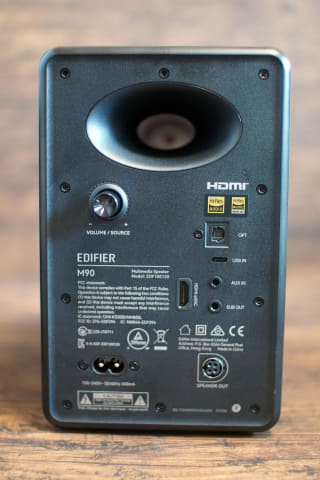 サイズは133×225×212mm(幅×奥行き×高さ)で、デスクトップスピーカーとしては標準的な大きさだ。ドライバ構成としては、35Wの4インチ アルミダイヤフラム ミッドバスと、15Wの1インチ シルクドームツイーターの2ウェイ。周波数特性は50Hz〜40kHzのハイレゾ仕様だ。背面には楕円形のバスレフポートがある。