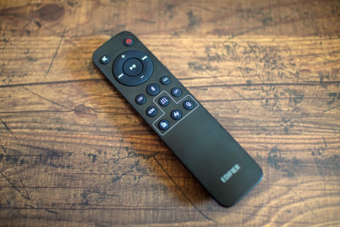 正面からの佇まいもシンプルなので、ディスプレイ脇に置いても目立たず画面に集中できる。またリモコンやスマホアプリからも操作できることで、近くに行かなくても操作できるのも、離れたところから視聴するプロジェクタユーザーにも便利だ。