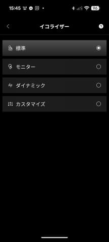 イコライザーは標準、モニター、ダイナミック、カスタマイズの4モードがある。それぞれのアイコンはリモコン上にあるアイコンボタンと対応している。
