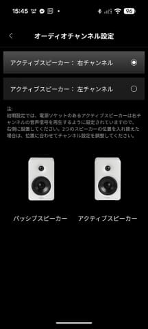 左右の組み合わせは右チャンネルと左チャンネルの入れ替えもできる。プロジェクタ投影の際には頭の後ろから鳴るという置き方をした場合でも、スマホアプリから簡単に左右入れ替えができる。左右入れ替えはサウンドバーではまず聞いたことがない機能なので、2個セットならではの利点だろう。