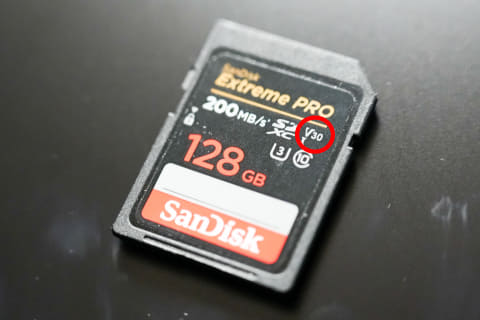 動画撮影用にSDカードを選ぶ際に確認したいのが「ビデオスピードクラス」。「V」の横に数字が書かれているマークだ。この数字が書き込み速度の最低保証速度を指していて、例えば「V60」の場合は最低保証速度「60MB/秒」を意味する。