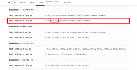 上の画像はソニー「α7C II」の製品ページ。赤枠で囲った部分が「200Mbps」となっているので、これを8で割った数字……「25MB/秒」が最低保証されているSDカードが必要、という計算になる。XAVC HS 4Kフォーマットの4:2:2、10bitの59.94p撮影でも、V30のSDカードを使えばOKというわけだ。