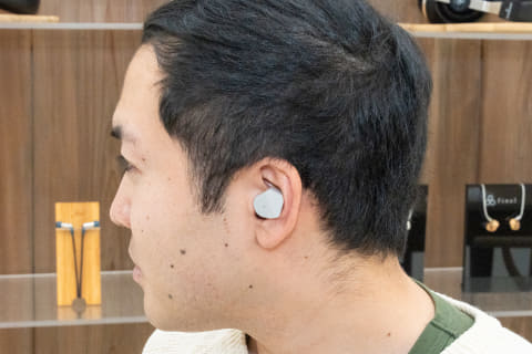 イヤフォンが、耳珠の内側に触れることで、音が再生されたときに微弱な振動が伝わることで、より脳が音を現実で起きている現象に錯覚するようなアプローチが取られている。