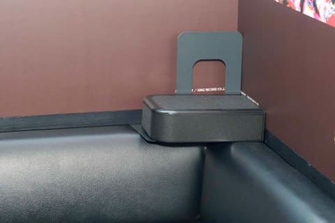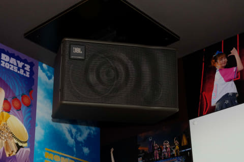 そして、カラオケ用のスピーカーもこの部屋だけ特別にJBL製のカラオケ用スピーカーを設置。ライブ映像の視聴後、カラオケタイムに突入しても、普段は味わえない音でカラオケを楽しめる。実際に少し音を出してもらったのだが、Bar 1300MK2で観たライブの音には届かないものの、サブウーファーが無いとは思えない低域が部屋全体を包み込んでいて、本人映像の楽曲などで特に盛り上がりそうだ。