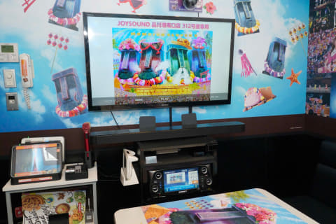今回は実際にそのコラボルームに潜入。結論を先に述べてしまうと、カラオケルームにサウンドバーを設置しただけとは思えない、思わず映像に見入ってしまう環境ができあがっていた。
