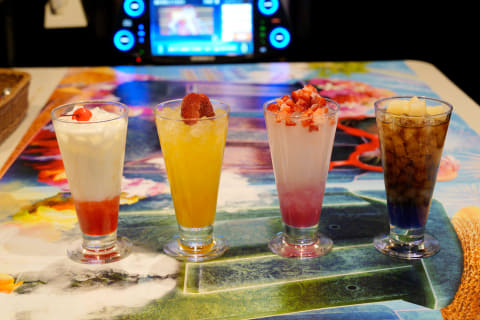 玉井さんイメージの黄色いドリンクは、マンゴーシロップにソーダ、上にフローズンのイチゴが載ったシンプルな構成。シロップ+ソーダの組み合わせは、甘くて飲みにくいものもあるのだが、このコラボドリンクはスッキリとした飲み応え。マンゴーシロップもクセがないタイプだ。