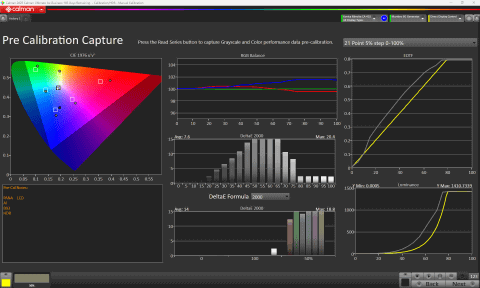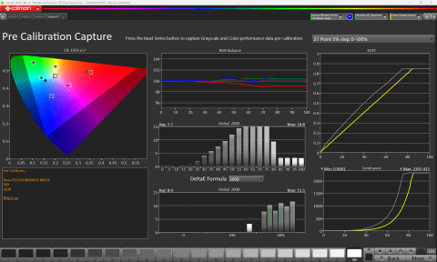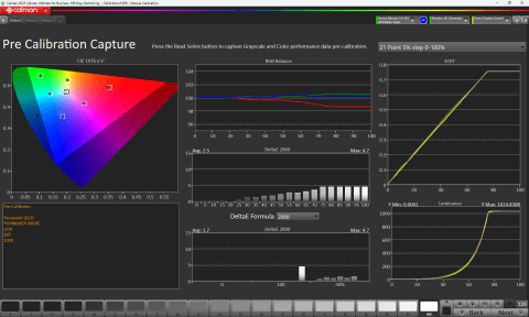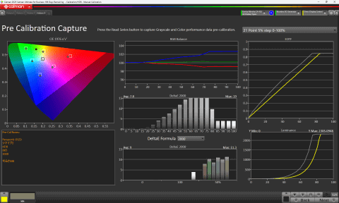 ・パターンジェネレータから、色温度D93/D65のHDR信号をテレビに入力。カラースペース(BT.2020)、EOTF、RGBバランス、色精度(デルタE)、10% Window(ピーク輝度)、100% Window(全白輝度)を、ソフトウェア「Calman Ultimate」で測定した